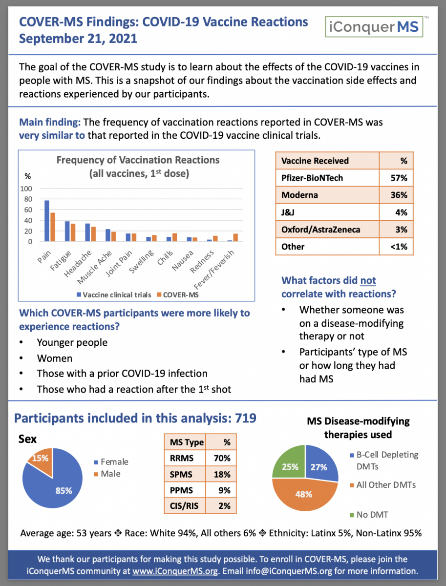 The results of the study have been published in a variety of formats (see below) to help inform education and treatment approaches, policies around access and health care delivery, and development of new research questions. iConquerMS has also used the results of these surveys when designing the COVER-MS study, our study of COVID-19 vaccinations in people with MS.