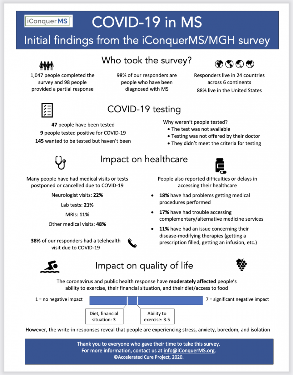 - To understand what people with MS know about COVID-19, their access to testing and treatment, and steps they were taking to avoid infection.