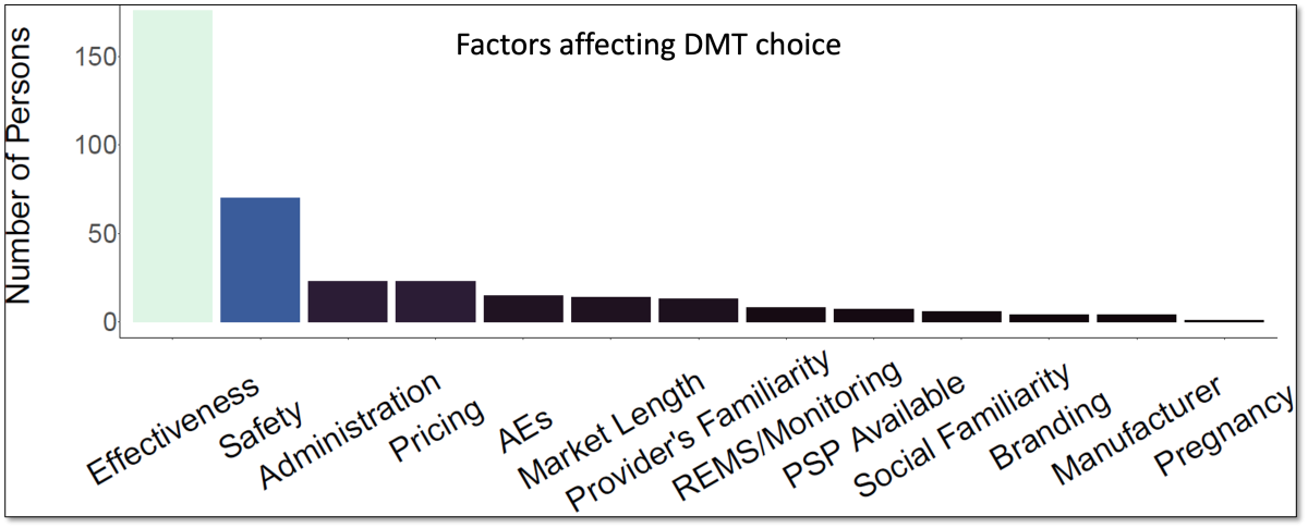 - When asked about the most important factor influencing their choice of DMT when switching, 69% of the participants selected DMT effectiveness. Safety, route of administration, and out-of-pocket costs were the next most commonly chosen factors.