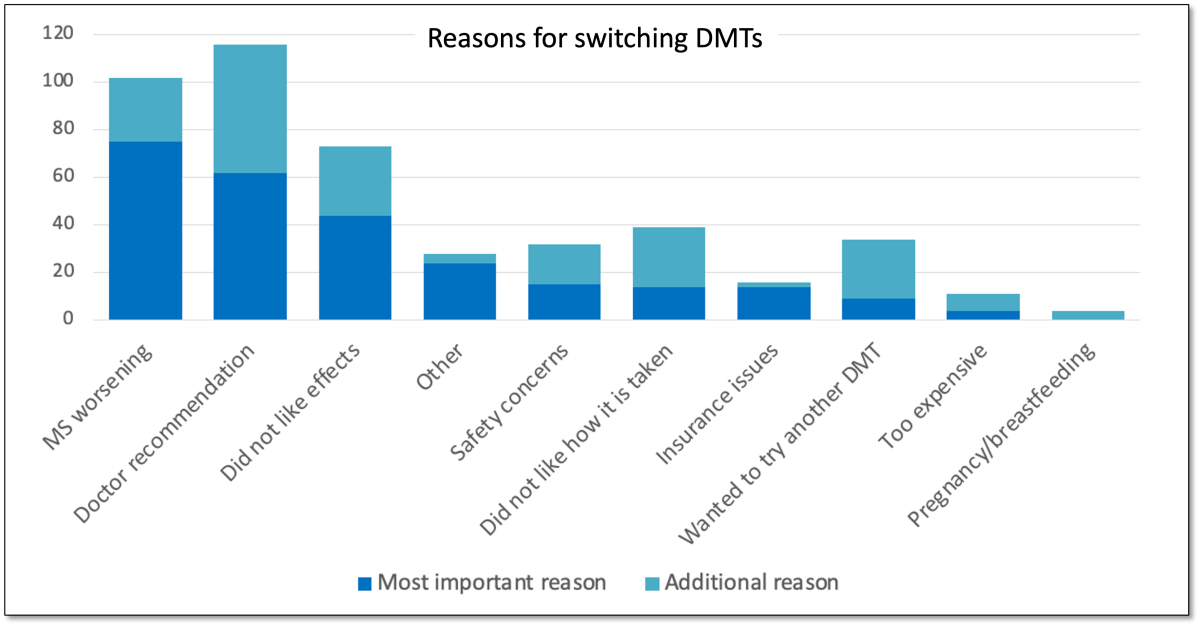 - Worsening MS, doctor recommendation, and side effects were the most common reasons cited for deciding to switch DMTs.