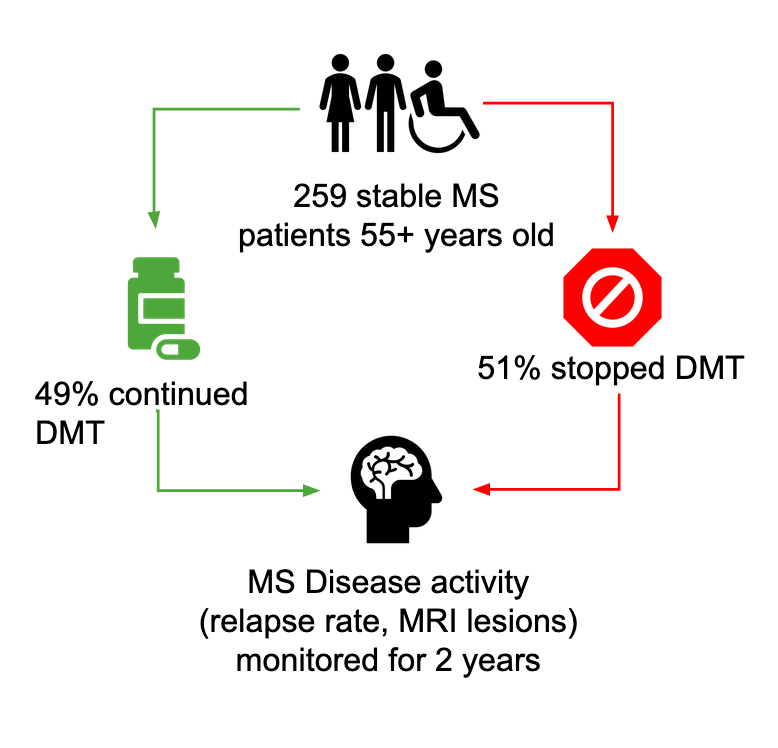 The research team conducted a study to determine if older patients who stopped taking DMTs had a higher risk of new relapses or new brain lesions compared to those who continued taking the medication. They also assessed whether stopping DMTs affected patients' level of disability.Participants were randomly assigned to either stop or continue taking their DMTs. They underwent MRI scans at the start of the study and at 6, 12, and 24 months to check for new or changing brain lesions. Additionally, participants had regular doctor visits and completed surveys about their symptoms every six months.