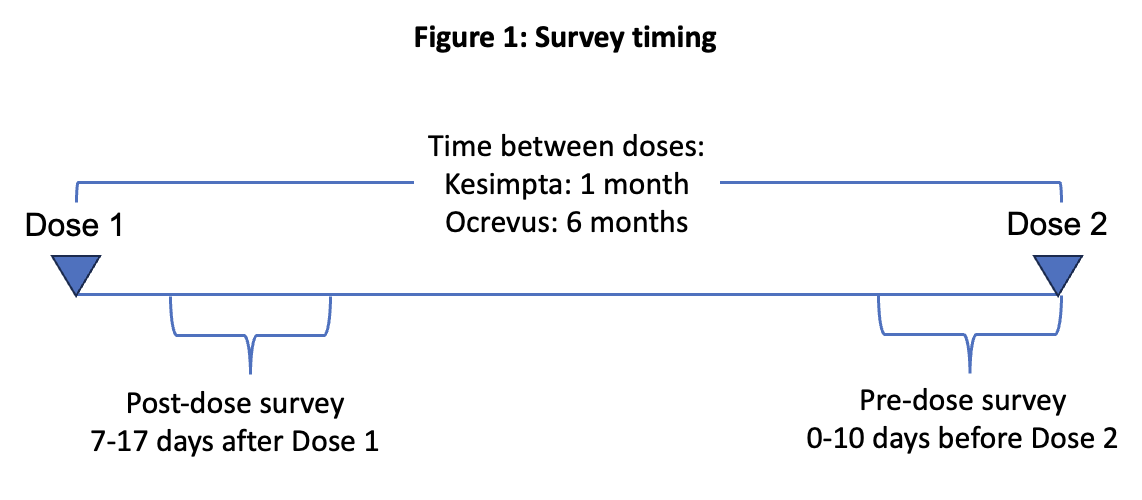 The analysis focused on whether participants experienced any worsening of symptoms between their next two doses of Ocrevus or Kesimpta, based on surveys taken 7-17 days after the initial dose and up to 10 days before the following dose.