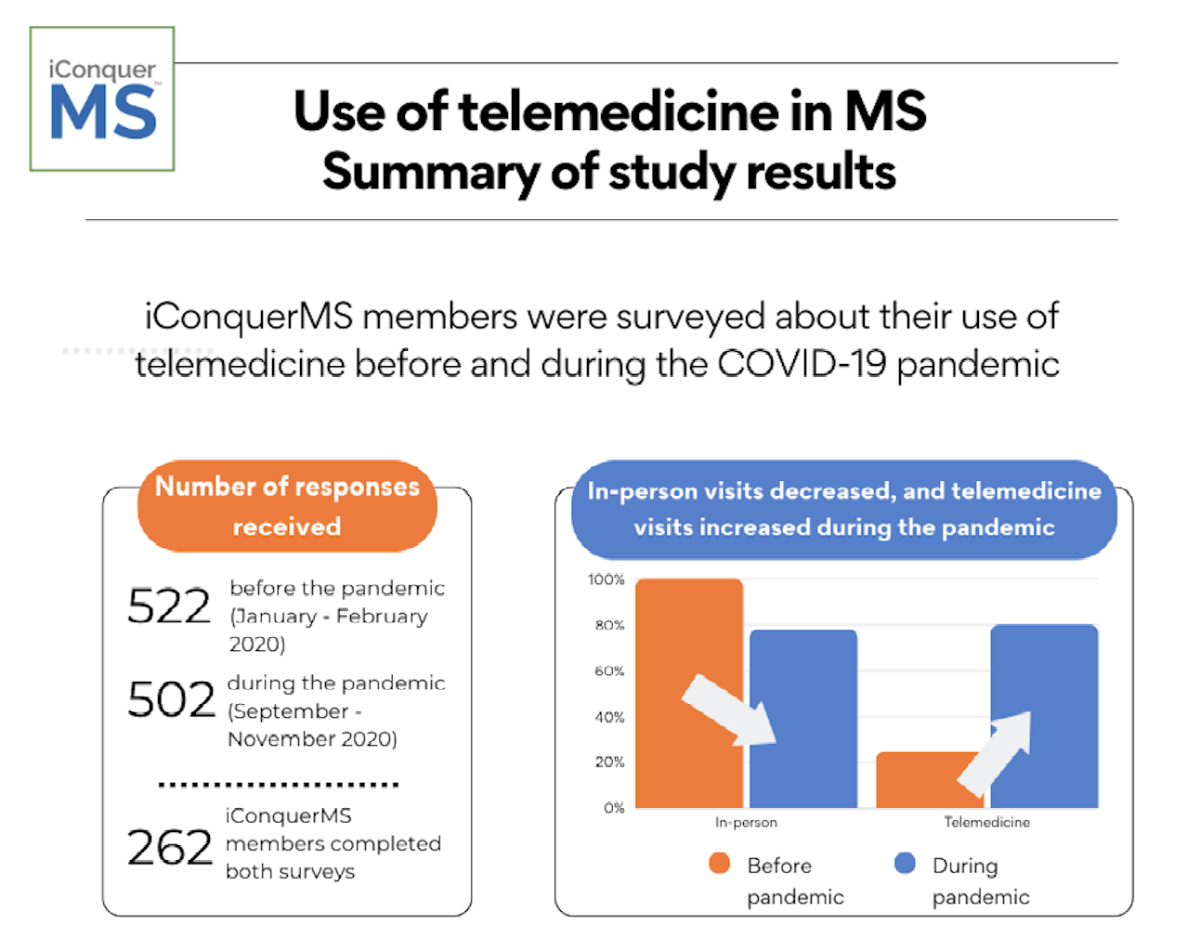 This study surveyed people with MS about their experiences with telemedicine before and during the COVID-19 pandemic. A subset of iConquerMS members were also interviewed to learn about their experiences in more detail.