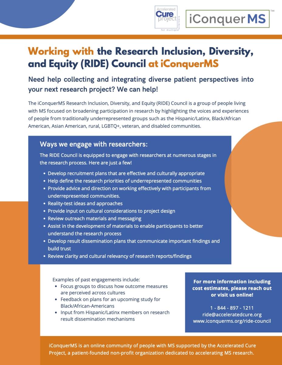 The Research, Inclusion, Diversity, and Equity (RIDE) Council is an initiative of the nonprofit organization Accelerated Cure Project (ACP). The RIDE Council’s focus is on increasing the diversity of ACP’s iConquerMS people-powered research network and providing resources to other research initiatives also seeking to diversify their study participation. The 28 Council members of the RIDE Council are people with MS belonging to racial, ethnic, and social groups that have been traditionally underrepresented in MS research, with a particular focus on the Black/African American and Hispanic/Latinx communities. Additional representation on the Council includes indigenous peoples, the LGBTQ+ community, Southeast Asian people, people with disabilities, people from rural communities, and veterans.